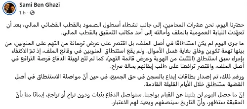 Dans son message, Sami Ben Ghazi affirme que cette décision « n’empêchera pas l’équipe de défense de poursuivre son devoir », assurant que les avocats continueront à défendre les prévenus « avec fermeté et sans relâche », dans l’attente de l’établissement de la vérité.
