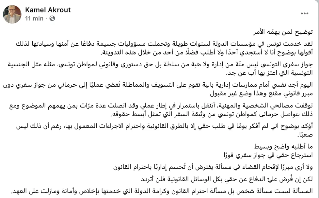 « J’ai servi la Tunisie au sein de ses institutions pendant de longues années, assumant des responsabilités majeures pour la défense de sa sécurité et de sa souveraineté. Je le dis avec clarté : je ne sollicite la faveur de personne et je n’attends aucun privilège », a-t-il écrit rappelant que son passeport n’est ni une faveur ni une concession administrative, mais un droit constitutionnel et légal, tout comme la nationalité tunisienne qu’il revendique avec fierté depuis plusieurs générations.