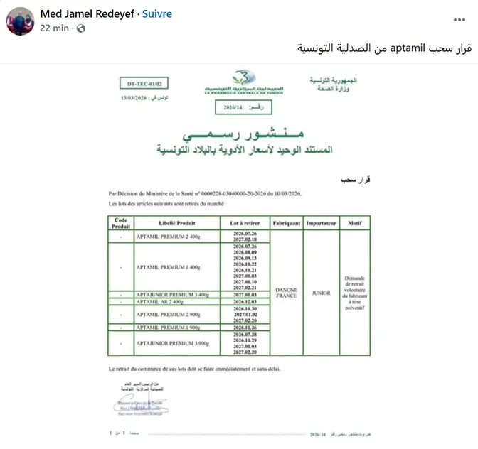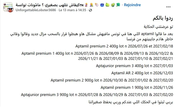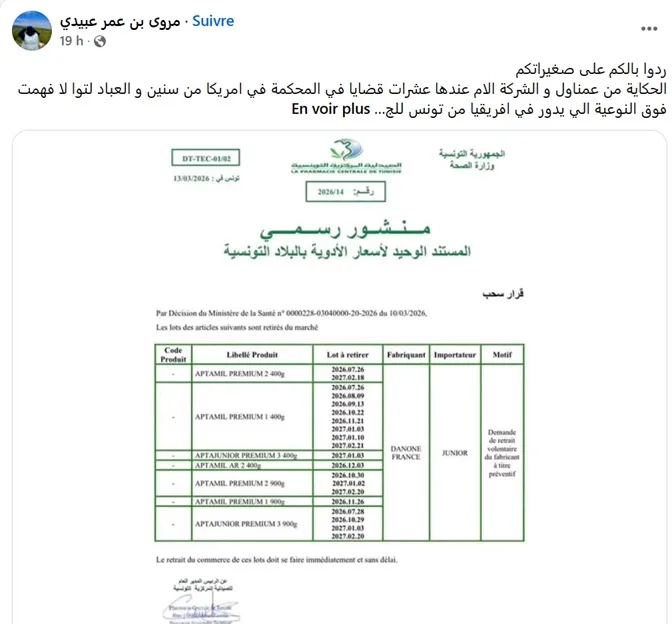 Depuis quelques jours, des publications largement relayées sur Facebook ont attiré l’attention sur la marque de lait infantile Aptamil. Ces messages affirment que le produit serait dangereux pour les nourrissons et s’appuient sur un document présenté comme un communiqué officiel annonçant son retrait immédiat des pharmacies en Tunisie. Certains contenus évoquent également des poursuites judiciaires anciennes et des différences de qualité selon les marchés.