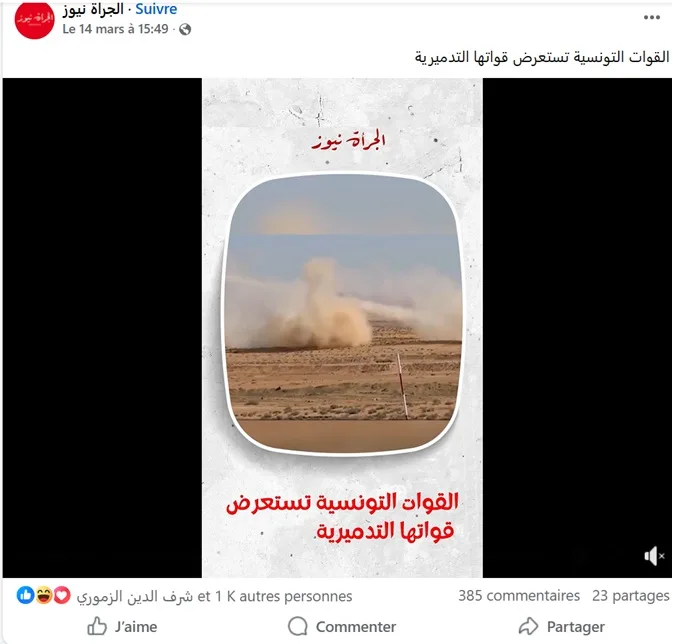 Depuis le 15 mars 2026, des vidéos circulent massivement sur Facebook montrant des tirs de roquettes et des manœuvres militaires. Partagées par plusieurs pages tunisiennes, elles sont souvent accompagnées de commentaires affirmant que la Tunisie se préparerait à la guerre ou qu’une menace imminente pèserait sur le pays. Ces images ont suscité de nombreuses interrogations chez les internautes, certains y voyant le signe d’une possible implication de la Tunisie dans les tensions régionales.