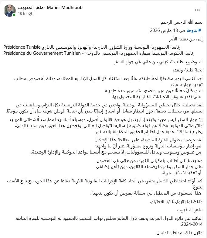 Maher Medhioub, dans son post, insiste sur le fait qu’il exigera son droit au passeport sans retard ni complication injustifiée, et qu’il se réserve le droit de recourir à toutes les voies légales nécessaires pour défendre ce droit.