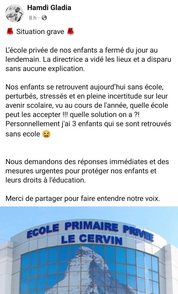 « L’école privée de nos enfants a fermé du jour au lendemain. La directrice a vidé les lieux et a disparu sans aucune explication. Nos enfants se retrouvent aujourd’hui sans école, perturbés, stressés et en pleine incertitude sur leur avenir scolaire. En cours d’année, quelle école peut les accepter ? Quelle solution avons-nous ? Personnellement, j’ai trois enfants qui se sont retrouvés sans école. Nous demandons des réponses immédiates et des mesures urgentes pour protéger nos enfants et leur droit à l’éducation. Merci de partager pour faire entendre notre voix. »