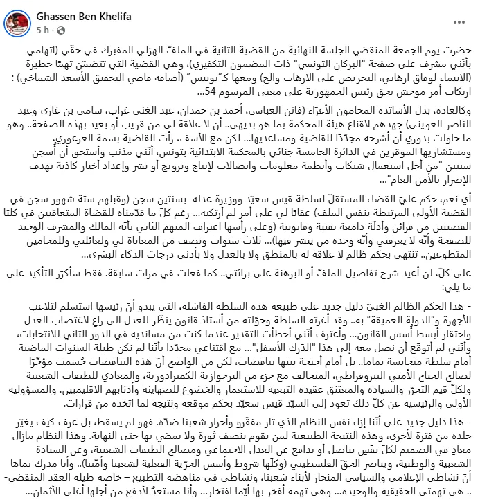 Il critique par ailleurs le contexte judiciaire et politique entourant cette affaire, mettant en cause les orientations du pouvoir en place dirigé par le président Kaïs Saïed.
