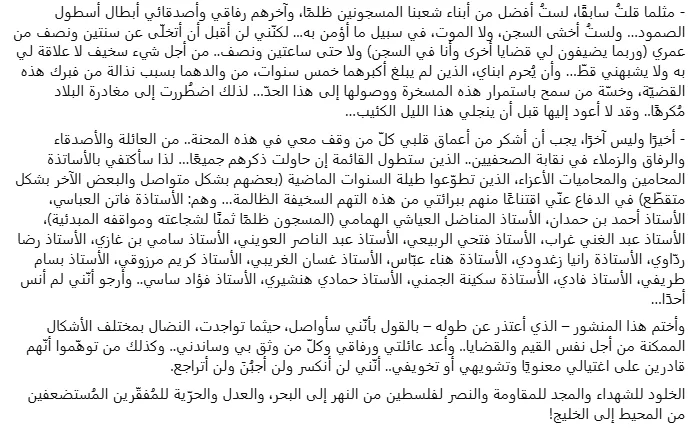 Il a également adressé ses remerciements à son collectif de défense, composé de plusieurs avocats et soutiens issus notamment du milieu journalistique et des droits humains.