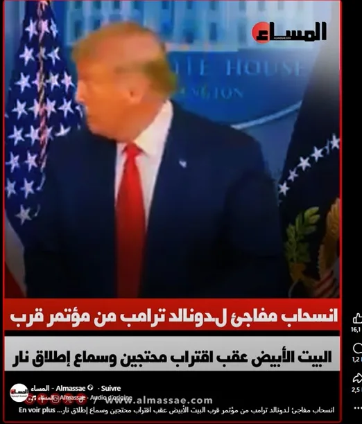 Un journal électronique nommé Al Masaa a publié le lundi 30 mars 2026, une information affirmant que Donald Trump aurait quitté précipitamment une conférence près de la Maison-Blanche après l’approche de manifestants et des tirs entendus à proximité. La séquence vidéo accompagnant cette affirmation a été largement relayée par plusieurs pages Facebook tunisiennes, donnant l’impression qu’il s’agirait d’un événement récent lié au contexte politique actuel. Face à la viralité de cette publication, nous avons procédé à une vérification approfondie.