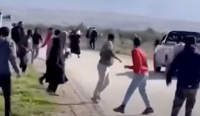 La séquence montre plusieurs dizaines de personnes rassemblées sur une route, dans un climat de vive tension, laissant apparaître une scène de confusion, marquée par des mouvements de foule et des échanges verbaux animés.