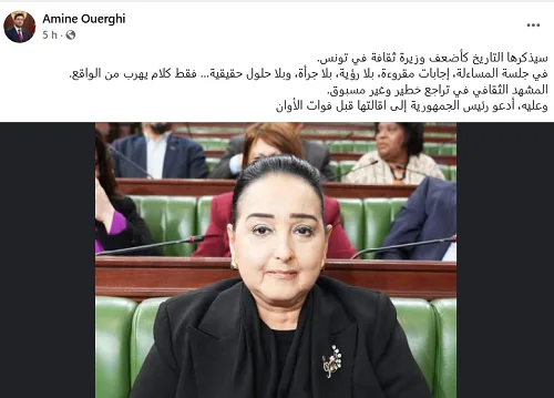Réagissant à cette séance, le député Amine Ouerghi a dressé un constat sévère, estimant que la ministre « restera dans l’histoire comme la plus faible ministre de la Culture en Tunisie ». Il a dénoncé des réponses « lues », « sans vision ni audace », et dépourvues, selon lui, de solutions concrètes face aux difficultés du secteur culturel. Le parlementaire a également pointé un discours qu’il juge « en décalage avec la réalité », appelant le président de la République à la limoger « avant qu’il ne soit trop tard ».