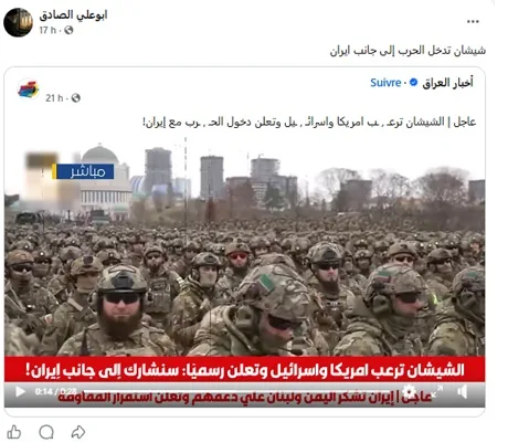 Une vidéo largement partagée, présentée comme un extrait de journal télévisé, a contribué à renforcer cette rumeur. Elle affirme que des unités tchétchènes auraient annoncé leur intention d’entrer en guerre aux côtés de l’Iran. Toutefois, après vérification, cette séquence ne repose sur aucune source officielle identifiable en provenance de la Tchétchénie. Les recherches menées à partir de sources fiables, de déclarations officielles et de la couverture médiatique internationale ne permettent donc pas de corroborer cette affirmation. Aucun élément tangible ne vient étayer l’idée d’une entrée en guerre de la Tchétchénie.
