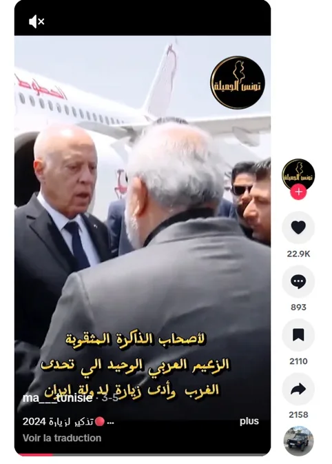 Sur TikTok, une vidéo virale circule depuis plusieurs jours, affirmant que Kaïs Saïed serait « le seul dirigeant arabe à avoir défié l’Occident en se rendant en Iran ». La séquence, largement relayée et cumulant des centaines de milliers de vues, montre des images de sa visite à Téhéran, accompagnées d’un texte laudatif présentant ce déplacement comme un acte politique isolé et exceptionnel.