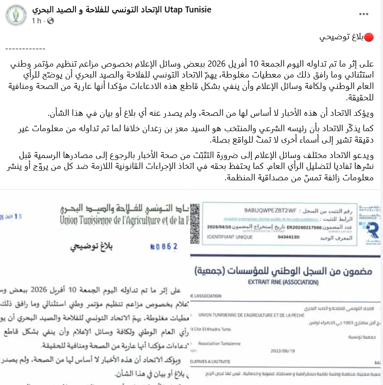 Un congrès extraordinaire qui n’existerait pas. En l’espace de quelques heures, l’Union tunisienne de l’agriculture et de la pêche (Utap) s’est retrouvée piégée dans un scénario désormais familier. Deux communiqués, deux lignes, deux réalités.