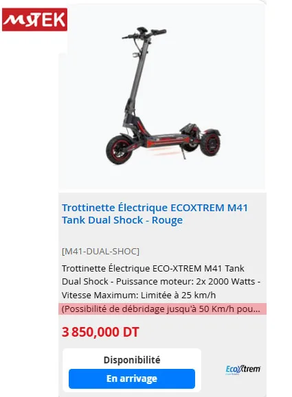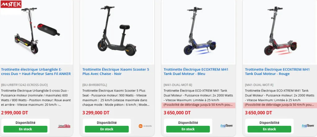 Sur le plus grand site de commerce en ligne en Tunisie, Mytek.tn, certaines trottinettes sont explicitement proposées avec des options de débridage permettant de passer de 25 à 50 km/h. Une pratique strictement interdite en Europe, puisqu’elle s’apparente à une invitation à la mort.