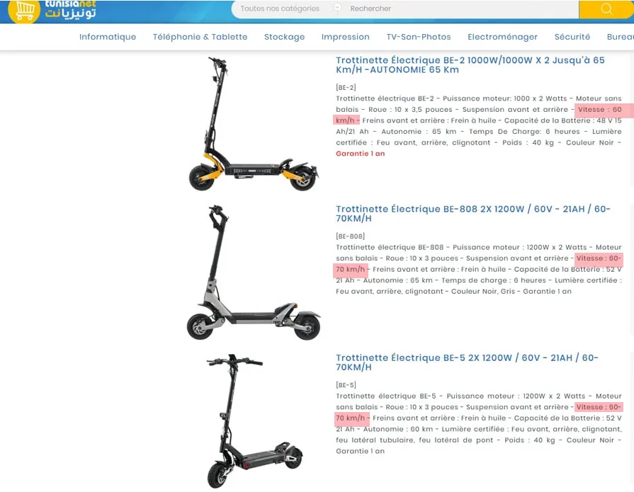 Sur Tunisianet.com.tn, deuxième plus grand site de commerce en ligne, le débridage n’est pas affiché, mais certains modèles atteignent des vitesses allant jusqu’à 70 km/h.