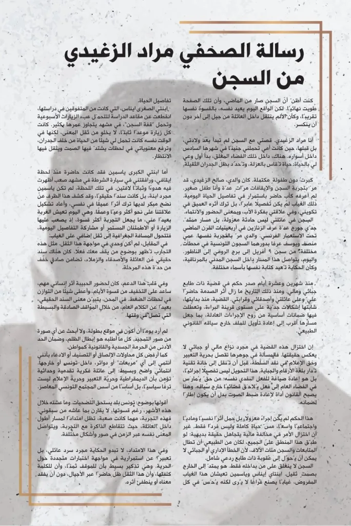 Incarcéré depuis près de deux ans dans le cadre d’une affaire à caractère financier et fiscal, le journaliste Mourad Zeghidi a choisi de s’exprimer à travers une lettre rédigée depuis sa cellule. Dans ce texte dense et introspectif, il est revenu sur son histoire personnelle, marquée par une mémoire familiale liée à l’emprisonnement, tout en dénonçant les conditions et le sens même de la procédure judiciaire engagée contre lui.