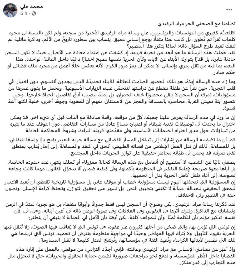 Mohamed Ali a conclu son message en exprimant sa solidarité avec Mourad Zeghidi et sa famille, tout en réaffirmant son engagement à porter ces questions dans les cadres institutionnels. Il a annoncé, d’ailleurs, son intention d’œuvrer en faveur de réformes destinées à mieux garantir les droits et libertés, afin que de telles situations ne deviennent pas, selon ses termes, « un destin qui se répète ».