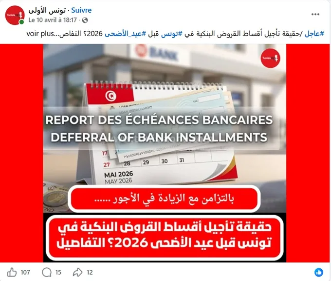 Sur Facebook, une publication circule affirmant qu’une mesure de report des échéances des crédits bancaires en Tunisie serait sur le point d’être appliquée avant l’Aïd el-Kebir 2026. Face aux nombreuses interrogations des internautes sur la véracité de cette information, nous avons mené une vérification.