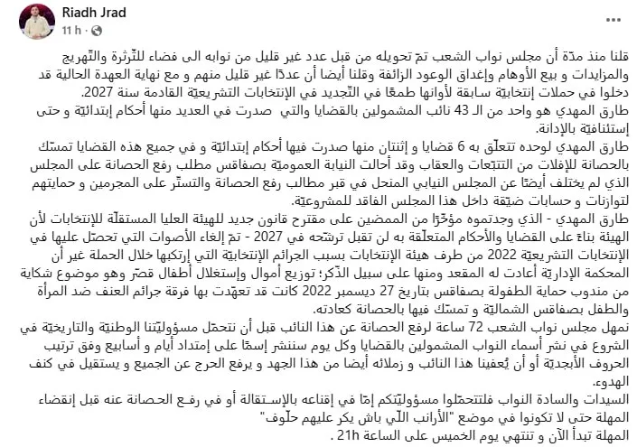 Dans un long message publié sur Facebook, Riadh Jrad est intervenu de manière spectaculaire. Dans ce texte, le chroniqueur proche du pouvoir et son porte-parole officieux, affirme que Tarak Mahdi figure parmi 43 députés faisant l’objet de poursuites judiciaires ou ayant déjà été condamnés dans certaines affaires.