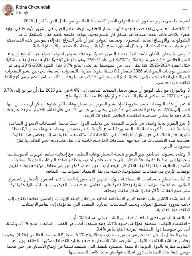 À travers cette lecture du rapport du FMI, Ridha Chkoundali met en évidence une réalité préoccupante : la guerre au Moyen-Orient ne constitue pas seulement un choc conjoncturel, mais un facteur de recomposition durable des équilibres économiques mondiaux. Dans ce nouvel environnement, les économies les plus fragiles, dont la Tunisie, apparaissent en première ligne face à des turbulences appelées à s’inscrire dans la durée.