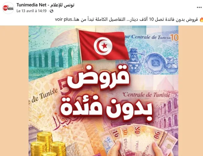 Plusieurs annonces sponsorisées sur Facebook affirment proposer aux Tunisiens des prêts « sans intérêts », invitant les internautes à cliquer sur un lien pour bénéficier de cette opportunité présentée comme exceptionnelle. Rapidement, de nombreux Internautes se sont interrogés sur la possibilité réelle d’obtenir un crédit sans aucun intérêt, certains y voyant une alternative attrayante.