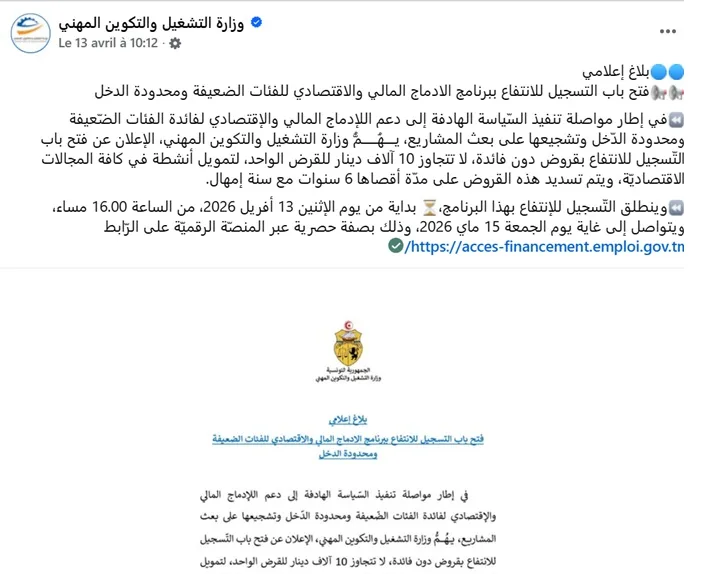En effet, un communiqué officiel attribué au ministère de l’Emploi et de la Formation professionnelle annonce l’ouverture des inscriptions à un programme d’intégration financière et économique destiné aux catégories vulnérables et à revenu limité. Selon ce communiqué, il s’agit de prêts sans intérêt, dont le montant ne dépasse pas 10.000 dinars par bénéficiaire, destinés à financer des activités dans différents domaines économiques.