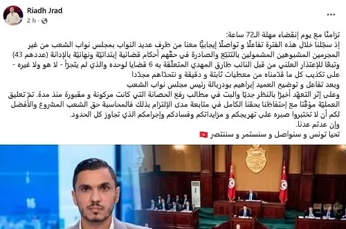 Lundi 13 avril à 21h06, Riadh Jrad lance un ultimatum à l’Assemblée des représentants du peuple : 72 heures pour lever l’immunité du député Tarak Mahdi, auteur de propos racistes et misogynes, ou obtenir sa démission, faute de quoi, une liste de 43 députés poursuivis ou condamnés serait publiée progressivement.