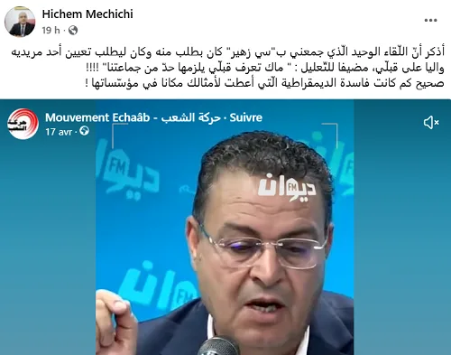 Il affirme que leur unique rencontre s’était tenue à la demande de Zouhair Maghzaoui, venu solliciter la nomination d’un proche à la tête du gouvernorat de Kébili, en expliquant qu’il fallait « quelqu’un des nôtres ».