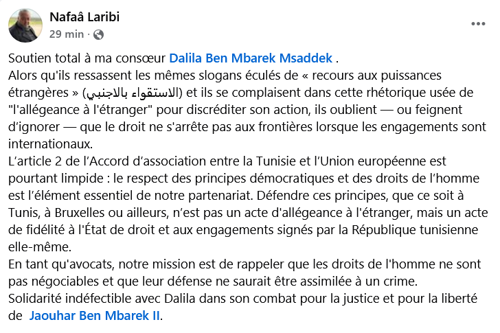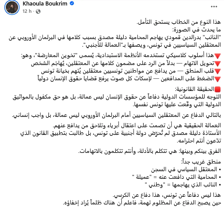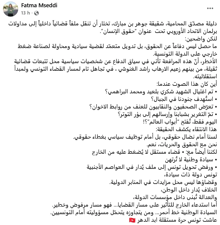Ces propos ont rapidement suscité des réactions critiques. La députée Fatma Mseddi a dénoncé, dans une publication, une « internationalisation délibérée d’une affaire souveraine », estimant que cette démarche vise à exercer une pression extérieure sur l’État tunisien.