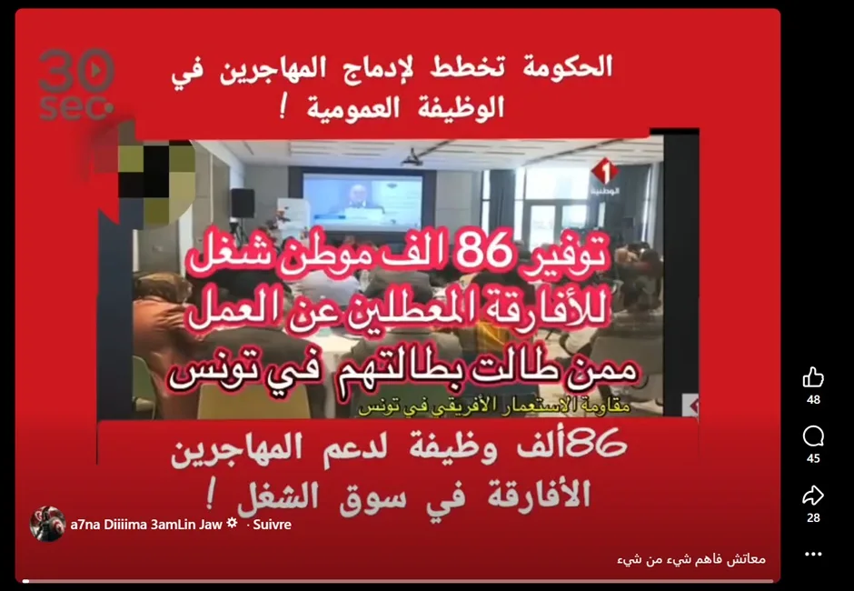 Après vérification, l’affirmation selon laquelle « le gouvernement tunisien va donner 86.000 emplois aux migrants subsahariens » est trompeuse. En procédant à une analyse de la vidéo par découpage (capture d’images clés et recherche inversée), nous avons pu retrouver son origine et il s’agit d’un extrait ancien, datant de 2022.
