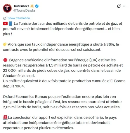 Sur la plateforme X, une publication virale affirme que « la Tunisie dort sur des milliards de barils de pétrole et de gaz » et pourrait devenir totalement indépendante sur le plan énergétique.