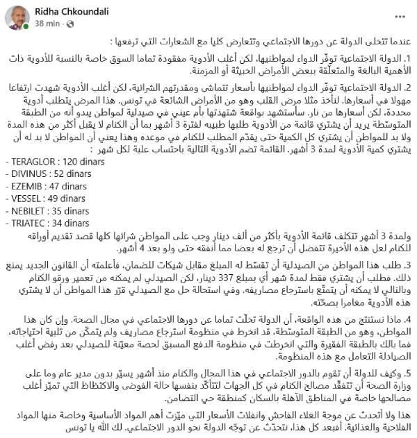 À travers cette publication, Ridha Chkoundali dresse le portrait d’un quotidien marqué, selon lui, par l’érosion du pouvoir d’achat, les obstacles bureaucratiques et la fragilisation des services publics.
