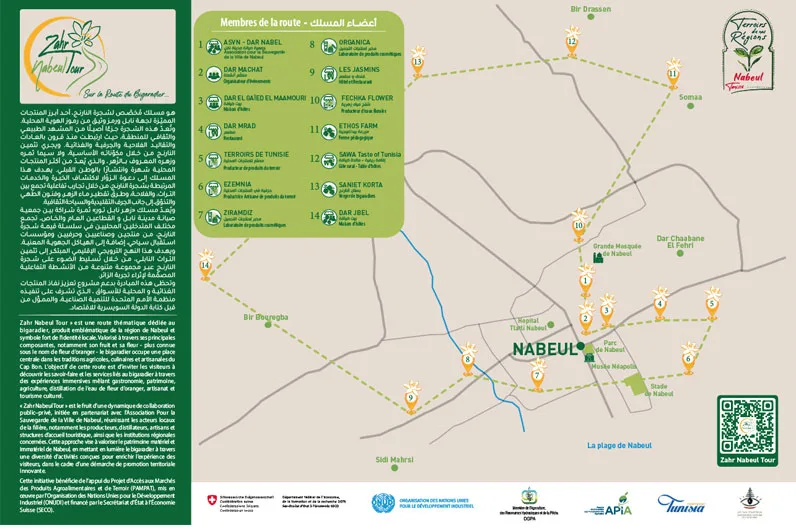 Développé dans le cadre de la stratégie nationale de valorisation des produits du terroir, portée par le Ministère de l’Agriculture (DGPA) en partenariat avec l’Agence de Promotion des Investissements Agricoles (APIA), et avec l’appui du projet PAMPAT (mis en œuvre par l’Organisation des Nations Unies pour le Développement Industriel – ONUDI, avec le soutien de la coopération suisse – SECO), « Zahr Nabeul Tour » s’inscrit dans une dynamique nationale de mise en valeur des produits du terroir et de leur intégration dans des expériences touristiques innovantes.