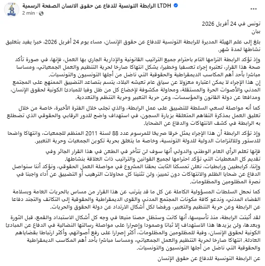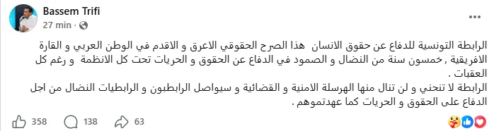 « La Ligue tunisienne de défense des droits de l’Homme, ce haut lieu du combat pour les droits et les libertés, ne pliera pas face au harcèlement sécuritaire et judiciaire », a écrit vendredi 24 avril 2026 son président, Bassem Trifi, dans une publication sur les réseaux sociaux.