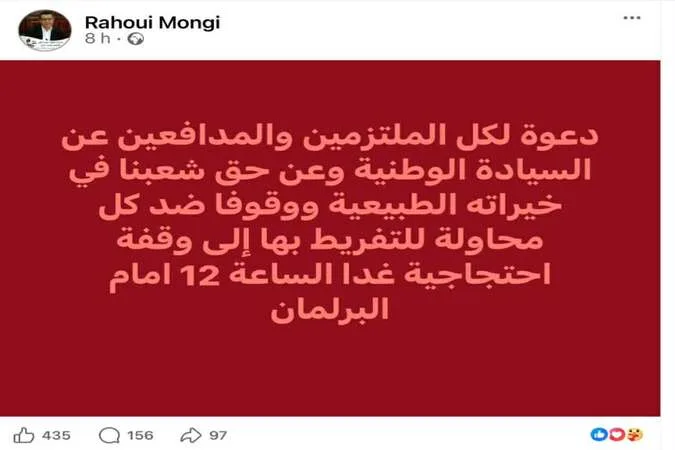 Dans un message publié sur Facebook ce lundi 27 avril 2026, Rahoui, auparavant fervent partisan du processus du 25-Juillet, invite les citoyens « soucieux de protéger la souveraineté nationale et le droit du peuple de profiter de ses richesses naturelles » à se mobiliser le lendemain, dénonçant ce qu’il qualifie de « tentative de porter atteinte à la souveraineté nationale ».