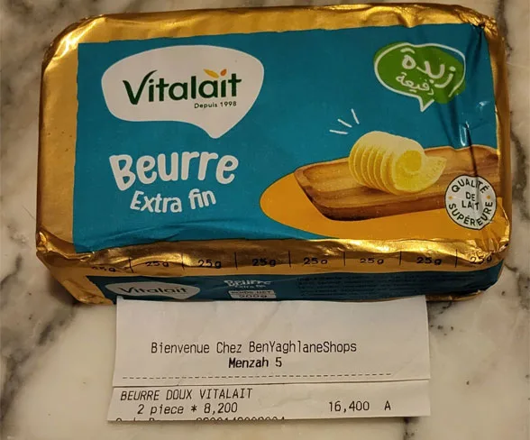 Le beurre atteint désormais des niveaux de prix qui frôlent l’absurde dans certaines grandes surfaces tunisiennes. Le paquet de 200 grammes est proposé jusqu’à 8,200 dinars, comme en atteste ce ticket de caisse largement partagé sur les réseaux sociaux.
