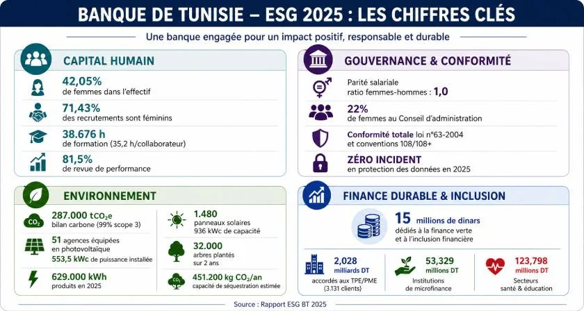 La banque met également en avant des indicateurs avancés en matière de capital humain, notamment en termes de diversité, d’égalité salariale et de formation. Les femmes représentent ainsi 42,05% de l’effectif total et 71,43% des recrutements, tandis qu’elles occupent 22% des sièges au Conseil d’administration. L’égalité salariale est affichée avec un ratio femmes-hommes de 1,0, et l’effort de formation a atteint 38.676 heures en 2025, soit 35,2 heures par collaborateur, avec un taux de satisfaction de 85%.