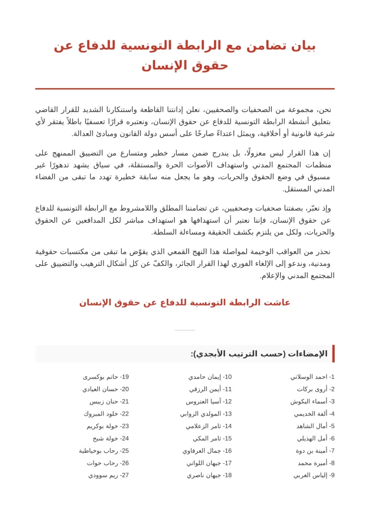 Dans leur déclaration, les signataires ont affirmé leur « solidarité totale et inconditionnelle » avec la Ligue tunisienne de défense des droits de l’Homme, considérant que les mesures prises à son encontre dépassent le cadre de l’institution pour toucher, plus largement, l’ensemble des acteurs engagés dans la défense des libertés et dans le travail de dénonciation et de contrôle.