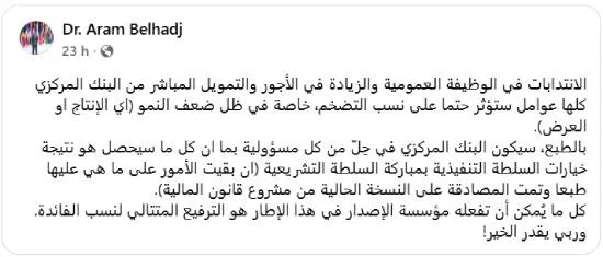 Selon lui, « la Banque centrale sera dégagée de toute responsabilité puisque ces conséquences découleront des choix de l’exécutif, validés par le législatif si la loi est adoptée telle quelle ». Il ajoute que la seule marge d’action de la Banque centrale serait alors « d’augmenter à plusieurs reprises les taux d’intérêt », concluant par une formule ironique : « Et que Dieu fasse que cela se passe bien ».