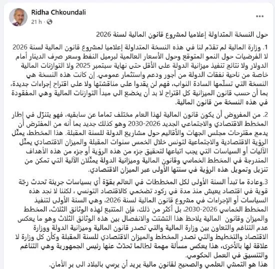 De son côté, Ridha Chkoundali, professeur universitaire en économie, a publié un post sur Facebook dans lequel il souligne plusieurs insuffisances dans la version du projet actuellement en circulation. Il note notamment que le document « ne présente ni les hypothèses de croissance, ni celles relatives au prix du pétrole, ni le taux de change du dinar, ni les résultats d’exécution du budget de l’État jusqu’à fin septembre 2025 ».