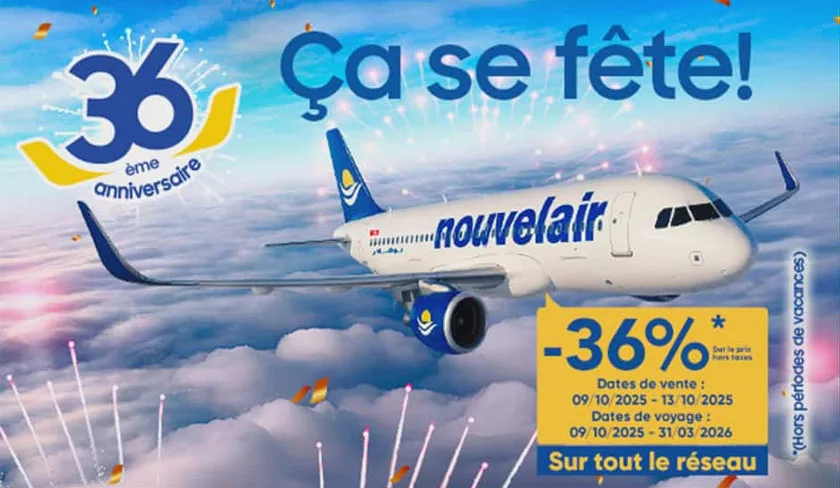 Communiqués Nouvelair célèbre son 36ème anniversaire et remercie ses passagers avec une offre exceptionnelle de 36 % de réduction sur tout le réseau 09/10/25