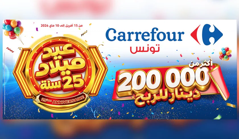 À l’occasion du 25ᵉ anniversaire de ses hypermarchés, Carrefour Tunisie organise une opération exceptionnelle du 15 avril au 10 mai …